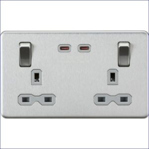 MLSFR9965BCG | KNIGHTSBRIDGE 2 GANG 13A SWITCHED PLUG SOCKET WITH FAST CHARGE DUAL USB C SOCKETS BRUSHED CHROME WITH GREY INSERTS