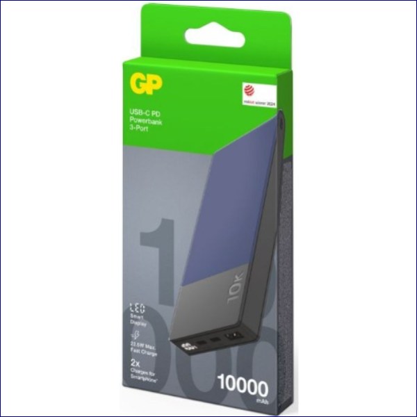 This mobile Powerbank with 22.5W max. output, from GP Batteries, is ideal for charging tablets and smartphones. It offers protection against over-voltage, over-current, over-charge, over-discharge, and over/under-temperature, as well as protection from short circuiting and loop-back. Easy-to-read digital display shows battery status and displays percentage of charge remaining.Features one USB-A port and 2 x USB-C ports offering simultaneous charging of up to 3 devices, with low power charging mode for gadgets such as smartwatches and Bluetooth headphones.Supports PD 3.0, QC 3.0, PPS, SCP, FCP and AFC fast charge.Delivers 10,000mAh for up to 0.7 charges for a tablet (based on iPad 9), or up to 2 charges of a smartphone (based on iPhone 14 Pro, with up to 58% charge within 30 mins).
