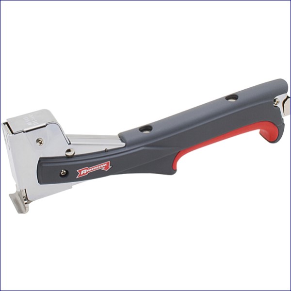 Arrow HTX50 Professional Hammer Tacker with steel construction, jam resistant mechanism and precision locked rear loading. It has an ergonomic soft rubber grip for easy all day use, a recessed hand grip which protects the hand from scraping, surface guard flange which reduces damage to surface and a knuckle guard which avoids surface impact on hand.