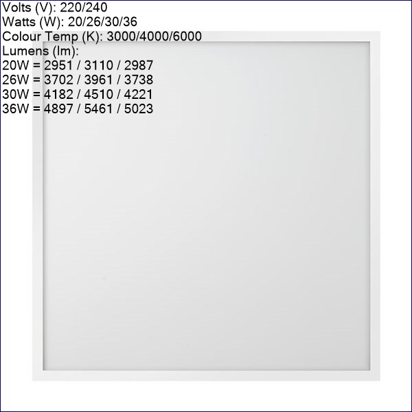 - Lumens (lm): 20W = 2951 / 3110 / 2987 26W = 3702 / 3961 / 3738 30W = 4182 / 4510 / 4221 36W = 4897 / 5461 / 5023