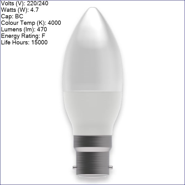 - Name: Genesis 4.7W LED Dimmable Opal Candle – BC – 4000K