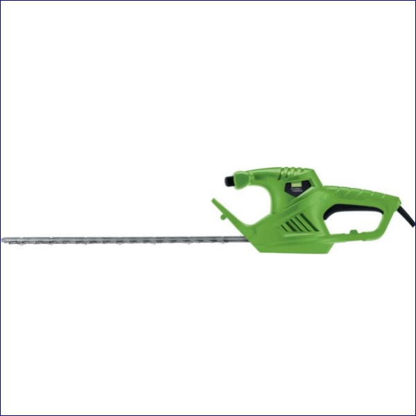 This lightweight hedge trimmer is equipped with high-quality 450mm long double-action blades. The robust 500W motor, metal gears and mechanical syncro help enhance the cutting performance. There is a two-handed VDE approved trigger switch with hand guard and quick-stop electronic brake for safety. The design incorporates strain-relief for the power cord and also a cable hook to help manage the power cord while trimming. Supplied with a transparent blade storage guard and fitted with 6m VDE approved cable and plug.