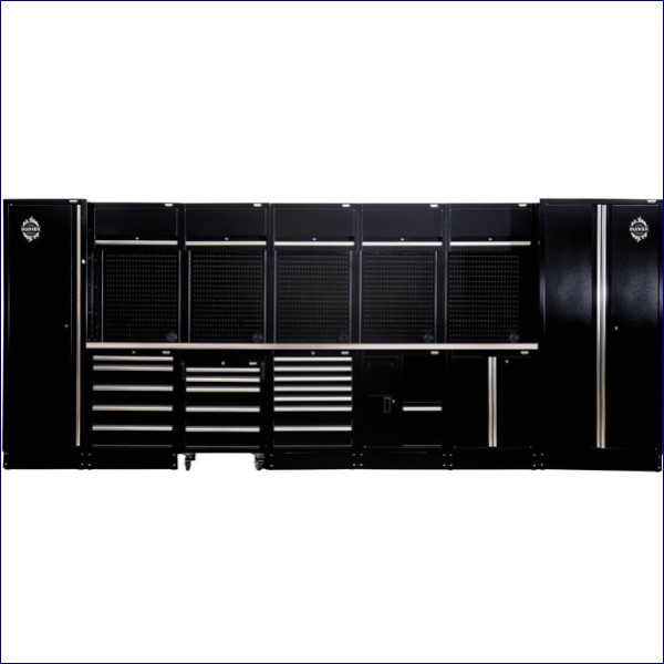 Part of the BUNKER® modular storage system. This stunningly designed combo is easily installed inside a garage or workshop to create your ideal storage system. All units are made from premium-quality steel and have a durable matt black textured industrial powder-coated finish. The floor cabinets provide incredibly versatile storage, featuring large cupboard spaces with fully adjustable shelves and smooth soft-close drawers lined with lush foam to protect your tools. They also offer a functional workspace with stainless steel worktops and an integrated rubbish bin and paper towel roll holder, plus a mobile cabinet with five drawers. The fixed base cabinets have adjustable feet for optimal positioning on an uneven floor. All wall cabinets have lift-up doors for convenient access, operated by whisper-quiet gas struts. For added storage, the back panels act as pegboards, and each includes one pre-cut hole for access to a power supply. Each unit has an integral lock for security and two keys are supplied. The combo comes with all the required fittings for simple installation. For your quality assurance, all BUNKER® units include a 10-year warranty. Every combo includes a free magnet of the distinctive BUNKER® logo.