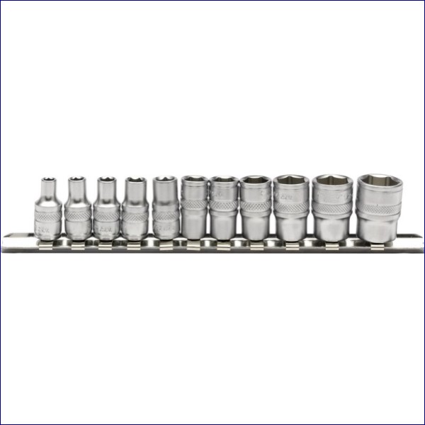 11 x Sockets: 5/32, 3/16, 7/32, 1/4, 9/32, 5/16, 11/32, 3/8, 7/16, 1/2, 9/16″