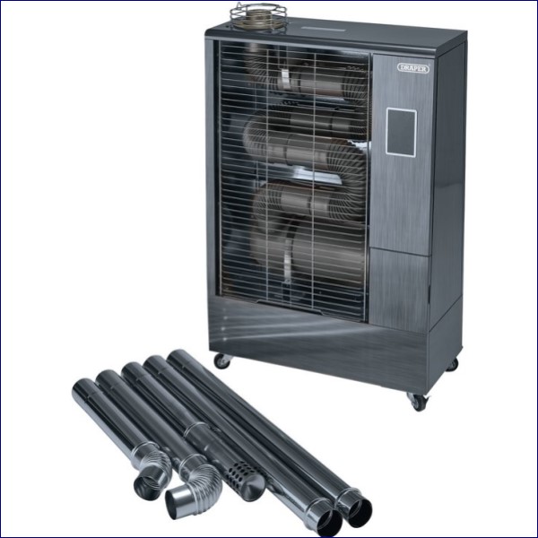 This indirect far infrared diesel heater with flue kit features a remote control and digital thermostat for easy heat control. It is economical, low noise, almost completely odourless and highly cost efficient to run. This heater consumes only 40W of electricity to keep the burner operating and it consumes as little as 0.9 litres of diesel fuel per hour. Unlike traditional fan heaters, infrared heat spreads evenly in all directions. Designed for heating spaces of approximately 66m2. Can be used in well-ventilated areas such as garages, barns, workshops, warehouses and marquees. The flue kit supplied allows for a more permanent installation and must be used for enclosed indoor areas (not well-ventilated). The LED control panel features a 24-hour timer and full thermostatic control, all conveniently operated by the remote control. It is fitted with wheels for manoeuvrability.