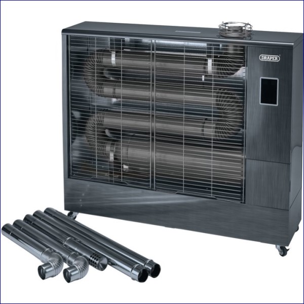 This indirect far infrared diesel heater with flue kit features a remote control and digital thermostat for easy heat control. It is economical, low noise, almost completely odourless and highly cost efficient to run. This heater consumes only 50W of electricity to keep the burner operating and it consumes as little as 1.7 litres of diesel fuel per hour. Unlike traditional fan heaters, infrared heat spreads evenly in all directions. Designed for heating spaces of approximately 110m2. Can be used in well-ventilated areas such as garages, barns, workshops, warehouses and marquees. The flue kit supplied allows for a more permanent installation and must be used for enclosed indoor areas (not well-ventilated). The LED control panel features a 24-hour timer and full thermostatic control, all conveniently operated by the remote control. It is fitted with wheels for manoeuvrability.