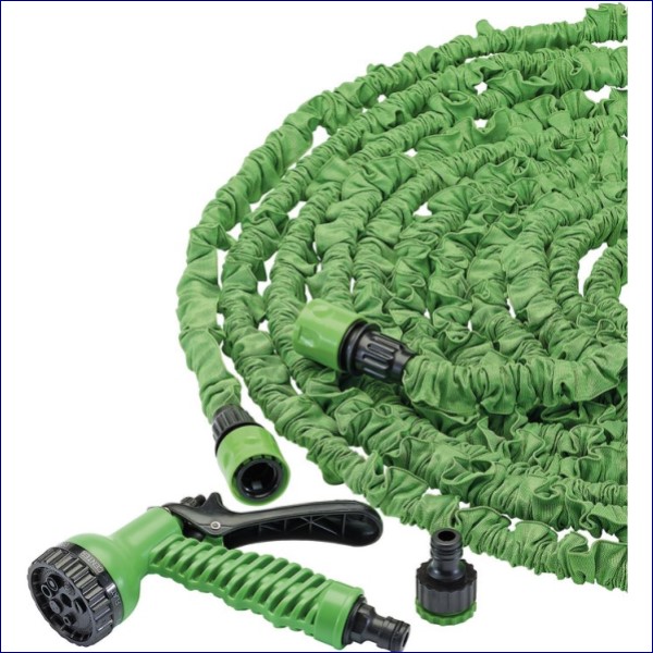 Lightweight expanding hose with trigger controlled spray gun. The polyester covered thermoplastic rubber hose can expand up to three times its original length. Unlike other hoses it will not knot or kink, ensuring an uninterrupted flow of water.