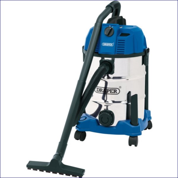 Robust model with stainless steel tank. The 30L tank is designed to pick up wet and dry materials. Ideally suited for use in workshops and around the home and garden. 5M (approx.) cable and approved plug. Fitted with on – board tool storage facility, castors for easy movability, carry handle, large drain plug, quick release clasps, dust clearing button and blower feature. Display carton.