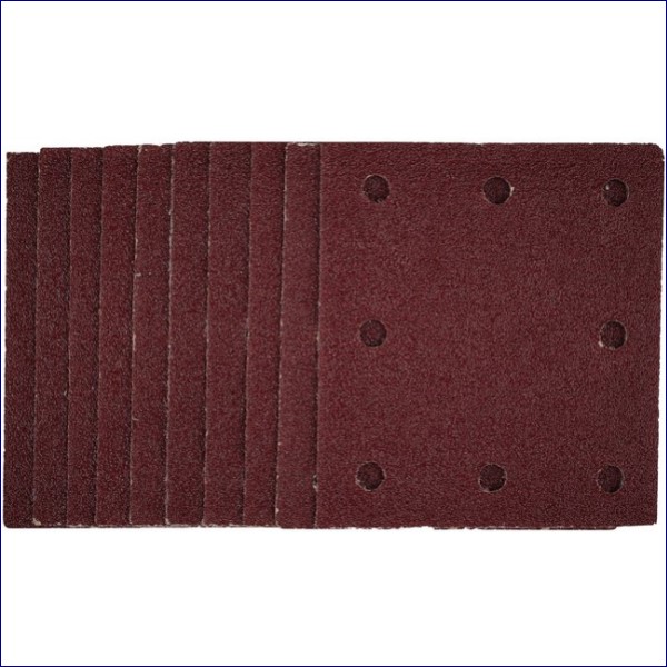 This pack of 1/4 sanding sheets (115 x 105mm) are made from premium quality aluminium oxide that is resin bonded to provide improved grain adhesion, anti-static qualities and long-lasting performance. The heavy-duty E-Weight backing paper makes the sanding sheet more durable – able to withstand the toughest jobs. The hook and loop backing offers decent adhesion to facilitate the fast changing of sanding sheets. The eight pre-punched 8mm holes improve dust extraction. Ideal for sanding and finishing wood, metal, aluminium alloy, painted surfaces, plastic and fillers. Compatible with most 1/4 sanders with hook and loop including Stock No. 57691.