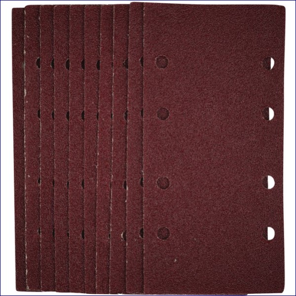This pack of 1/3 sanding sheets (93 x 190mm) are made from premium quality aluminium oxide that is resin bonded to provide improved grain adhesion, anti-static qualities and long-lasting performance. The heavy-duty E-Weight backing paper makes the sanding sheet more durable – able to withstand the toughest jobs. The hook and loop backing offers decent adhesion to facilitate the fast changing of sanding sheets. The eight pre-punched 8mm holes improve dust extraction. Ideal for sanding and finishing wood, metal, aluminium alloy, painted surfaces, plastic and fillers. Compatible with most 1/3 sanders with hook and loop including Stock No. 57839.