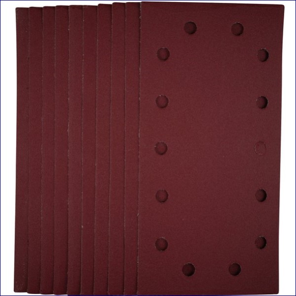 This pack of 1/2 sanding sheets (115 x 230mm) are made from premium quality aluminium oxide that is resin bonded to provide improved grain adhesion, anti-static qualities and long-lasting performance. The heavy-duty E-Weight backing paper makes the sanding sheet more durable – able to withstand the toughest jobs. The hook and loop backing offers decent adhesion to facilitate the fast changing of sanding sheets. The 14 pre-punched 8mm holes improve dust extraction. Ideal for sanding and finishing wood, metal, aluminium alloy, painted surfaces, plastic and fillers. Compatible with most 1/2 sanders with hook and loop including Stock No. 57941.