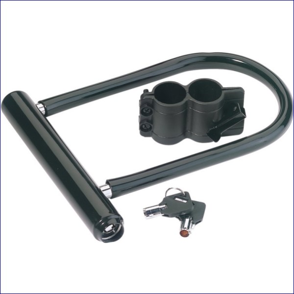 This shackle lock secures bicycles and is PVC coated for corrosion protection. Supplied with mounting bracket for carrying on bicycle and two keys.