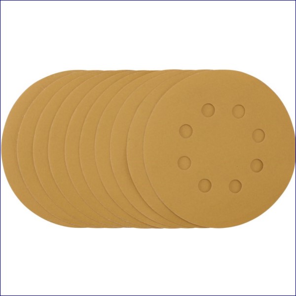 Pack of 10 gold sanding discs made from aluminium oxide with a special treatment of calcium stearate which is resin bonded to provide self-sharpening and anti-clogging performance. The heavy-duty D-Weight backing paper makes the sanding disc more durable – able to withstand the toughest jobs. The hook and loop backing offers decent adhesion to facilitate the fast changing of sanding discs. The eight pre-punched 8mm holes improve the dust extraction during sanding. Ideal for sanding and finishing wood, metals – including ferrous alloys, painted surfaces, varnish, plastic and fillers. Compatible with all 125mm random orbit sanders with a hook and loop backing pad, including Draper Stock No. 58097 and 89522.