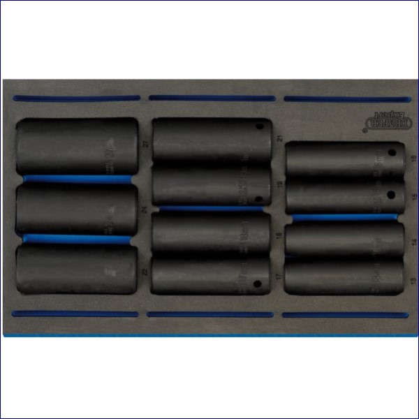 Expert Quality, each six point deep impact socket is manufactured from chrome vanadium steel, which is correctly hardened and tempered with a black phosphate chrome finish. Supplied complete in a two tone 1/4 drawer EVA insert tray made from closed cell foam. Suitable to be used in Draper and Draper Expert tool chests and other manufacturers similar tool chests.