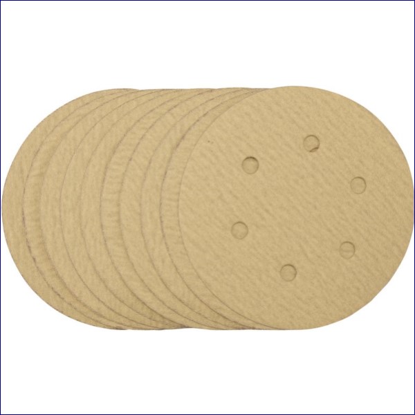 Pack of 10 gold sanding discs made from aluminium oxide with a special treatment of calcium stearate which is resin bonded to provide self-sharpening and anti-clogging performance. The heavy-duty D-Weight backing paper makes the sanding disc more durable – able to withstand the toughest jobs. The hook and loop backing offers decent adhesion to facilitate the fast changing of sanding discs. The six pre-punched 8mm holes improve the dust extraction during sanding. Ideal for sanding and finishing wood, metals – including ferrous alloys, painted surfaces, varnish, plastic and fillers. Compatible with all 150mm random orbit sanders with a hook and loop backing pad, including Draper Stock No. 65084, 83942 and 84125.