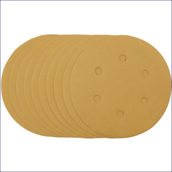 Pack of 10 gold sanding discs made from aluminium oxide with a special treatment of calcium stearate which is resin bonded to provide self-sharpening and anti-clogging performance. The heavy-duty D-Weight backing paper makes the sanding disc more durable – able to withstand the toughest jobs. The hook and loop backing offers decent adhesion to facilitate the fast changing of sanding discs. The six pre-punched 8mm holes improve the dust extraction during sanding. Ideal for sanding and finishing wood, metals – including ferrous alloys, painted surfaces, varnish, plastic and fillers. Compatible with all 150mm random orbit sanders with a hook and loop backing pad, including Draper Stock No. 65084, 83942 and 84125.