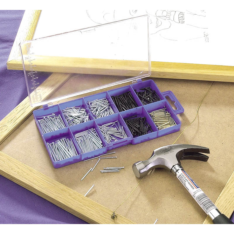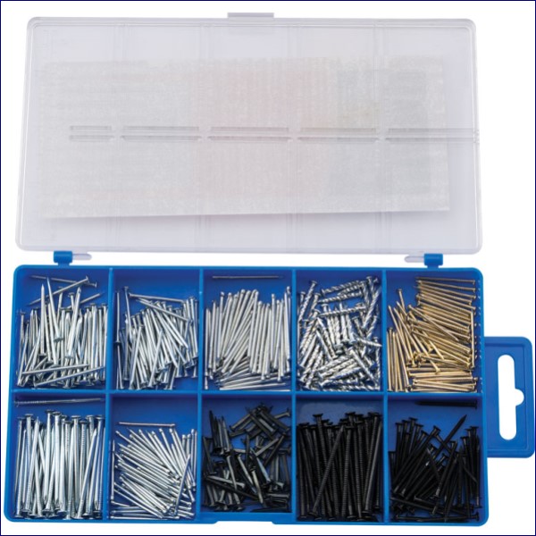A selection of popular nails and pins. Includes various panel pins, ring nails, drive nails, round wire nails, lost head nails, square twist nails. Packed in plastic storage case shrink wrapped for security.