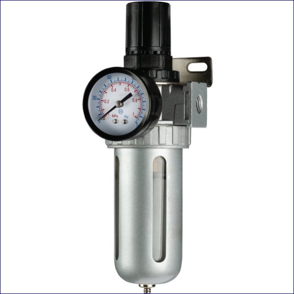 Designed to eliminate moisture and particulates from the airflow. The main body of this unit is aluminium with polished silver finish. The gauge has steel casing and is duel-marked with psi and Mpa. Steel screw-on transparent bowl. Manual/semi-automatic drain, fitted with 40-micron filter. Complete with wall bracket.