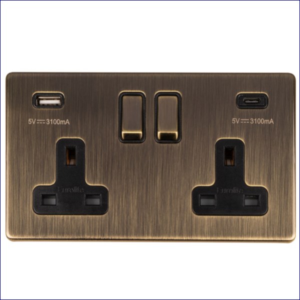 2 gang 13Amp Switched Socket With 3.1Amp USB Outlet (1x Type A, 1x Type C). Flat Concealed Plate Antique Brass with Matching Rockers.