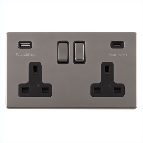 ELECBN2USBCB | EUROLITE CONCEALED BLACK NICKEL 2 GANG SOCKET USB A AND USB C WITH BLACK TRIM