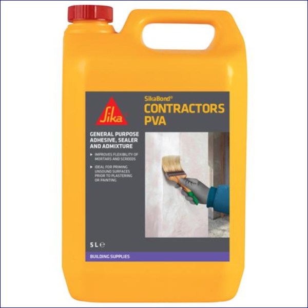 SikaBond® Contractors PVA is a multi-purpose, water-based adhesive, primer, sealer, and mortar admixture. It adheres to most common building materials, excluding PVC and rubber, and is ideal for priming unsound surfaces before plastering or painting, enhancing cement mixtures and dust sealing on flaking paintwork and walls.