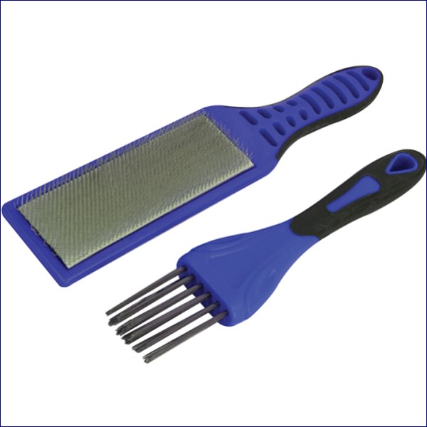 Two wire brushes particularly suited for clearing the cutting teeth of wood and metal files by quickly removing material shavings and swarf. Each brush has a sturdy, soft-grip plastic handle with an integral hanging hole for convenient storage.