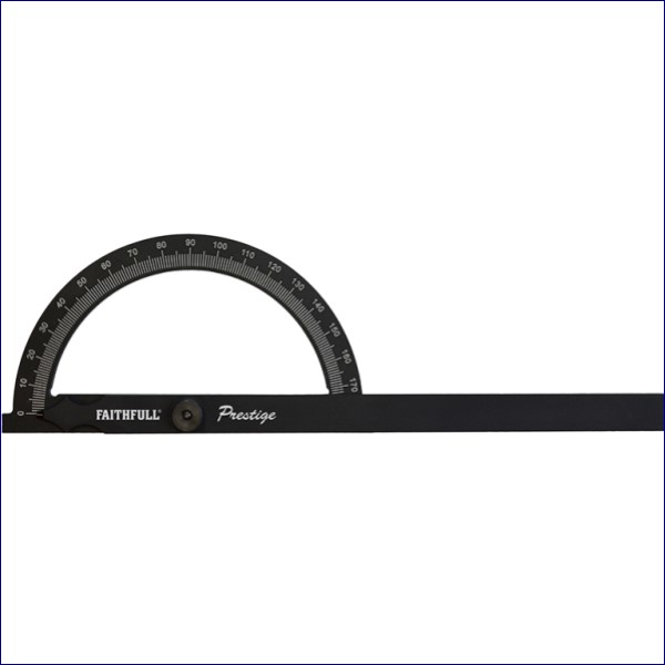 The protractor features laser etched graduations from 0-180°. It is used to determine existing angles, as well as creating new angles, setting bevels and transferring angles from one surface to another. A knurled thumb-nut allows the rule to be locked at a chosen angle.