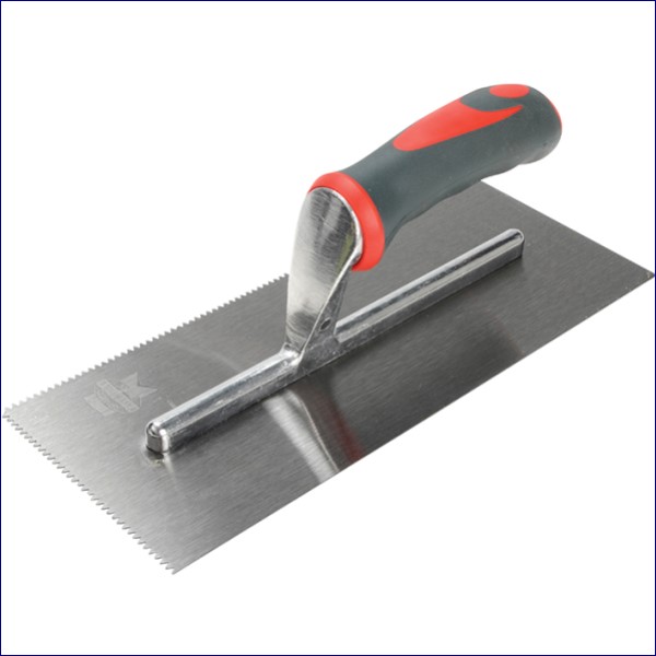 The Faithfull Notched mastic trowel which is specifically designed for the application of adhesive prior to the setting of tiles. The 3mm V-notched blade is ideal for applying wall tile adhesive and the two straight edges for finishing and cutting off. The blade is made from carbon steel for durability and a long working life and is fitted with a full size soft grip handle for user comfort.