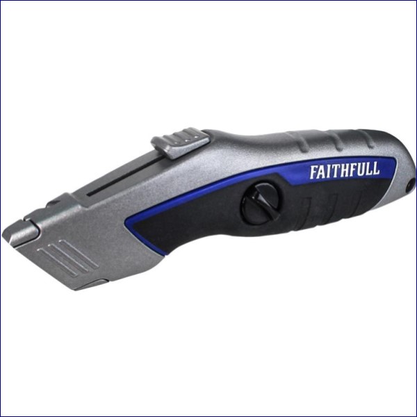 The Faithfull Professional Safety Utility Knife has a spring-loaded blade holder that automatically retracts when the slider button is released to keep the blade out of harm’s way. The die-cast metal body has an interlocking nose design to reduce sideways blade movement, a dual compound ABS and TPR soft grip for comfort, and a hole for attaching to a lanyard.