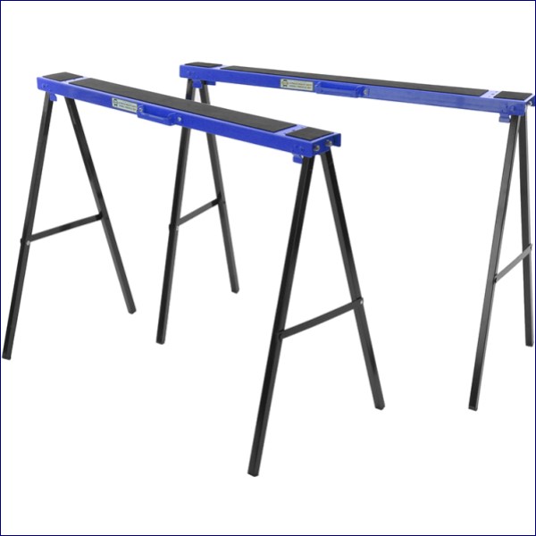 The Faithfull trestle set with slip resistant worktops and securely locking legs for improved stability. Each trestle has a safe working load of 200kg (440lbs) and folds flat for easy storage. An integral handle allows easy transportation.