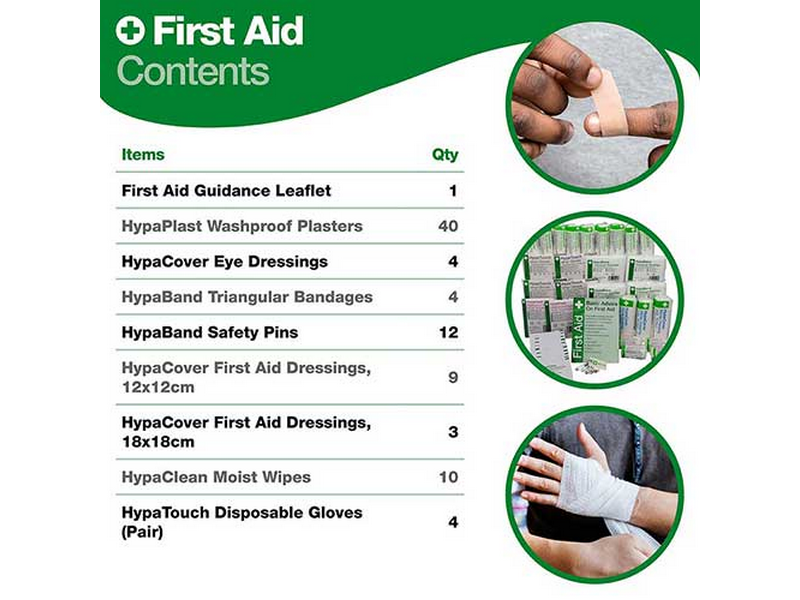 The HSE 11-20 Person Workplace First Aid Kit, Medium contains all the sterile first aid dressings, plasters, wipes and gloves that are recommended by the HSE.