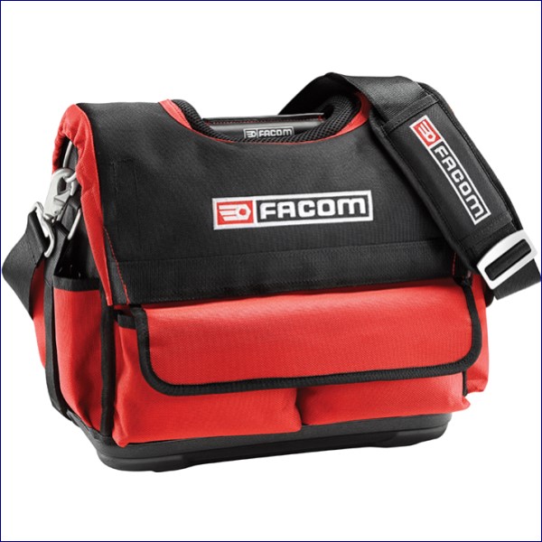 Facom Fabric Toolbox made with a very high strength (1,200 x 1,200 denier) fabric. Rigid, waterproof tool compartment, aluminium handle with leather grip and a padded shoulder strap.