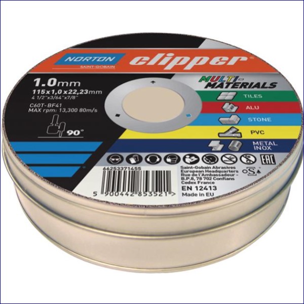The Norton Clipper® 115mm Multi-Purpose Cutting Disc produces less dust, less noise and a precise, straight cut on all materials including metal-inox, stone, aluminium, PVC, ceramics and tiles. One product for all jobs. Supplied in a handy tin with 10 discs.