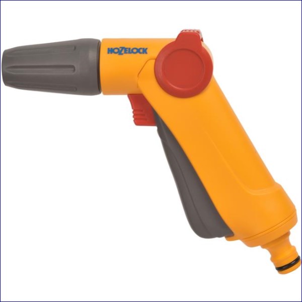 Hozelock Jet Spray Gun with a lockable front trigger, which turns water on and off, and an easy-to-use thumb-operated flow control switch.