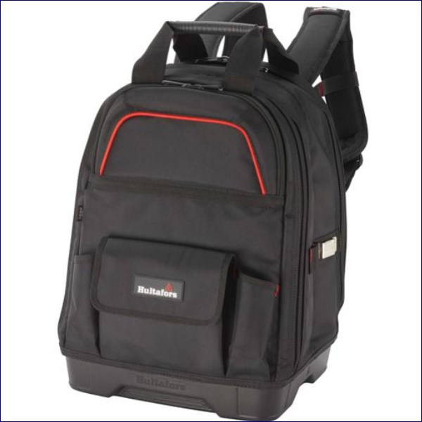 The Hultafors Moulded Base Tool Backpack offers the ultimate combination of comfort and practicality. It has 42 pockets and tool holders, including a metal clip for measuring tapes and a water bottle pocket. There are also two main zippered compartments with additional laptop/tablet sleeve.