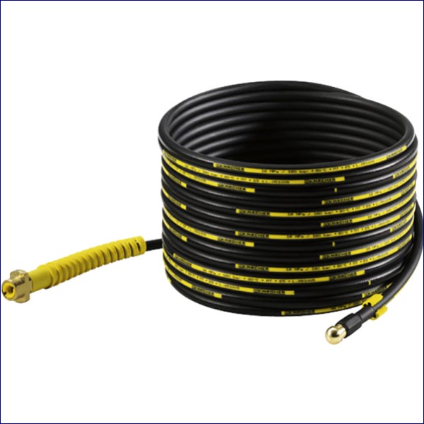 The Kärcher drain cleaning kit clears blocked pipes and drains, downpipes and toilets. Four backwards firing high-pressure jets propel the hose into the pipe and clear the blockage. It has consecutive marks and marker ring to show progress in the pipe.