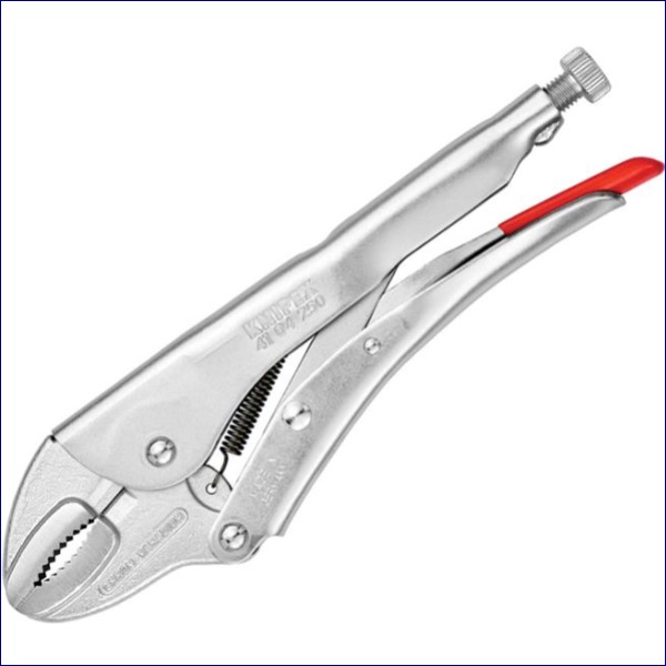 The Knipex 41 04 Series Universal Grip Pliers hold section and flat material securely. The Plier body is made from high strength spring steel, and inserted jaws are made of chrome vanadium steel, drop forged. Heavy-duty model with wire cutter. High clamping strength by elbow lever action. With adjustment screw and release lever, single hand operation.