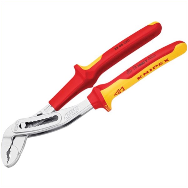 These Knipex 88 06 Series Alligator® VDE Water Pump Pliers are fitted with multi-component grips, VDE tested up to 10,000V and safe for work up to 1,000V. They conform to DIN EN / IEC 60900. Self-locking on pipes and nuts: no slipping on the workpiece and low handforce required. With a box-joint design for high stability.