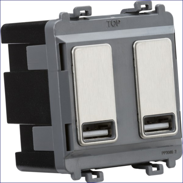 MLGDM016BC | KNIGHTSBRIDGE DUAL USB CHARGER MODULE (2 X GRID POSITIONS) 5V 2.4A (SHARED) – BRUSHED CHROME