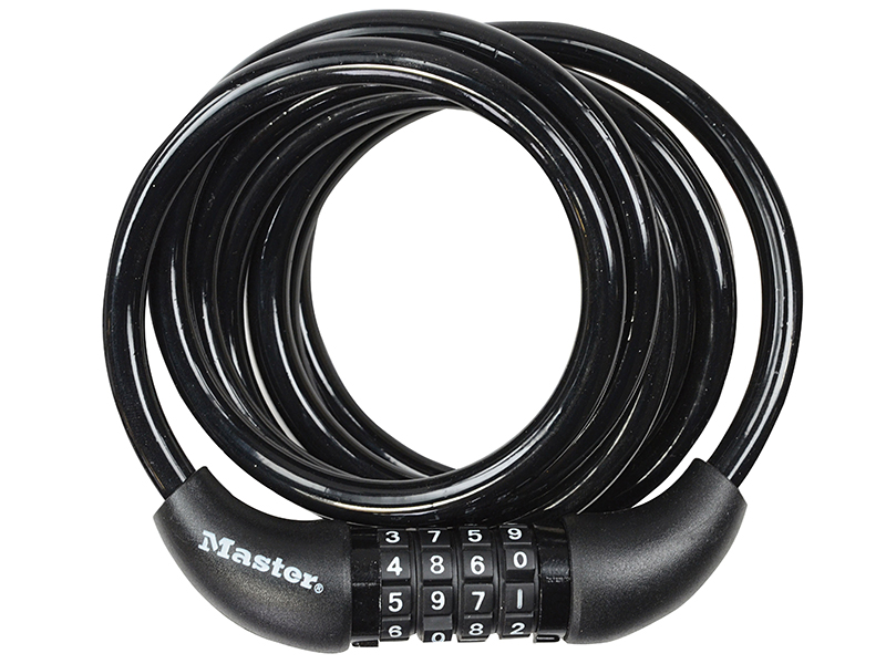 Master Lock 1.8m Self Coiling Combination Cable with a pin tumbler cylinder and a coloured vinyl covering that helps to prevent scratching.