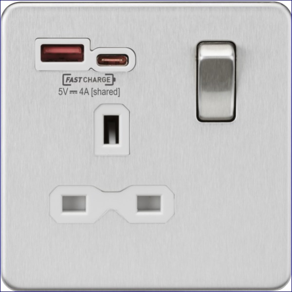 MLSFR9919BCW | KNIGHTSBRIDGE 1 GANG 13A SWITCHED PLUG SOCKET WITH FAST CHARGE DUAL USB A AND C SOCKETS BRUSHED CHROME WITH WHITE INSERT
