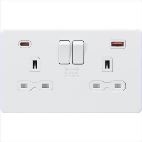 MLSFR9945MW | KNIGHTSBRIDGE 2 GANG 13A SWITCHED PLUG SOCKET WITH FAST CHARGE DUAL USB A AND C SOCKETS MATT WHITE WITH WHITE INSERT