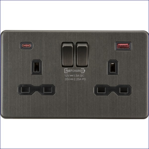 MLSFR9945SB | KNIGHTSBRIDGE 2 GANG 13A SWITCHED PLUG SOCKET WITH FAST CHARGE DUAL USB A AND C SOCKETS SMOKED BRONZE WITH BLACK INSERT