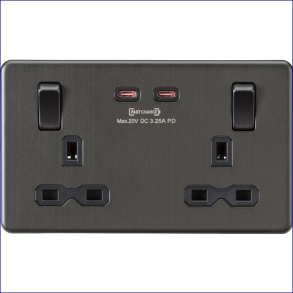 MLSFR9965SB | KNIGHTSBRIDGE 2 GANG 13A SWITCHED PLUG SOCKET WITH FAST CHARGE DUAL USB C SOCKETS SMOKED BRONZE