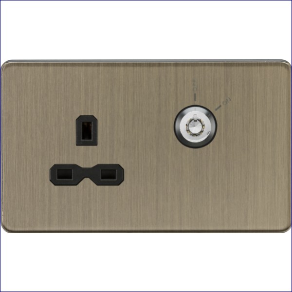 MLSFR9LOCKAB | KNIGHTSBRIDGE 13A KEY LOCKABLE PLUG SOCKET (2 GANG PLATE) ANTIQUE BRASS WITH BLACK INSERT
