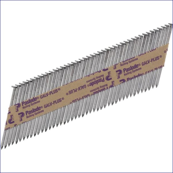 Paslode IM350+ Nails have a clipped head with a diamond point for easy insertion. The Galv-Plus® finish meets the Eurocode 5 requirements for applications in service class 1 and 2 (indoor and covered outdoor). Specification: Zn / Al alloy approx. 15µm. Patented paper strip collation, eliminates paper residue under the nail heads and prevents damage to your Gas Framing Nailer.