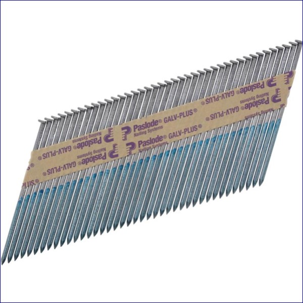 Paslode IM350+ Nails have a clipped head with a diamond point for easy insertion. The Galv-Plus® finish meets the Eurocode 5 requirements for applications in service class 1 and 2 (indoor and covered outdoor). Specification: Zn / Al alloy approx. 15µm. Patented paper strip collation, eliminates paper residue under the nail heads and prevents damage to your Gas Framing Nailer.
