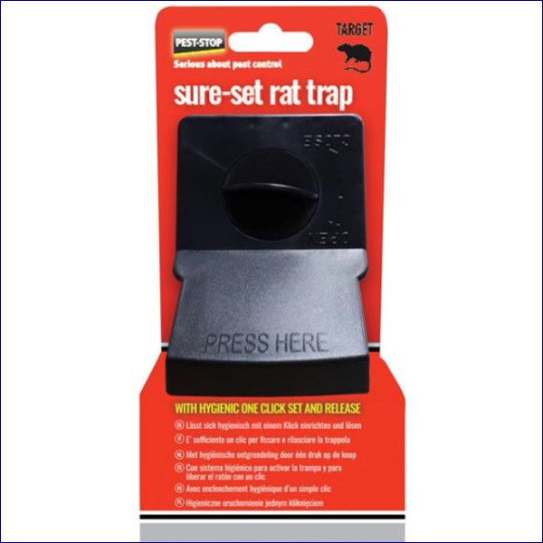 The Pest-Stop (Pelsis Group) Sure-Set Plastic Rat Trap has been designed to provide a quick, powerful and humane killing action. A one-click setting and release mechanism, and no-touch disposal, make this hygienic trap ideal for domestic users. A bait well eliminates the chance of bait theft.