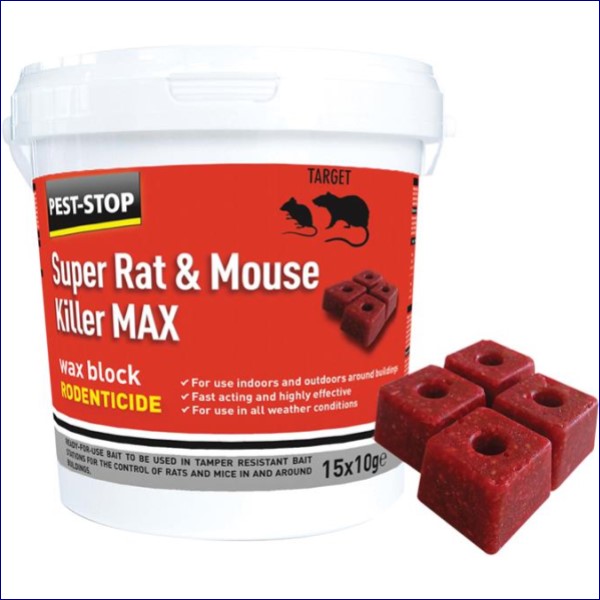 Pest-Stop Super Rat & Mouse Killer MAX Wax Blocks are fast acting with no known resistance. Effective in damp areas. Contains brodifacoum (legally compliant 25ppm). It has a highly attractive chocolate scent. Packed into plastic tubs for freshness and durability. Recommended for use with bait station, easy to secure within lockable bait boxes. Directions for use included.