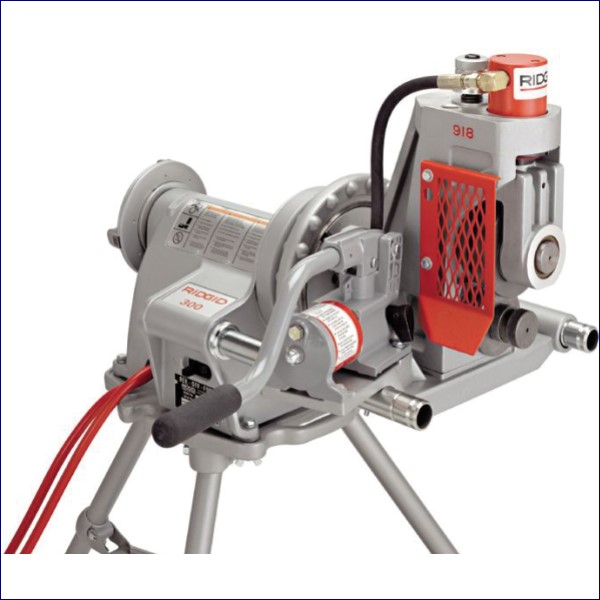 The Ridgid 918 Hydraulic Roll Groover features a powerful 15-ton hydraulic ram in a compact, easy to transport unit. With one man set-up and operation, it is the ideal groover for job site requirements. The 918 mounts quickly to RIDGID 300 power drive and 535, 1822, or 1224 Threading Machines. Designed to provide maximum efficiency, it is capable of grooving up to 12in Schedule 10 and 8in Schedule 40 standard wall pipes. Roll Set changeout is accomplished in seconds.